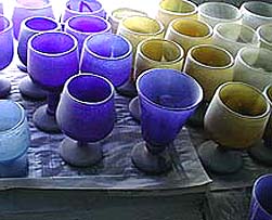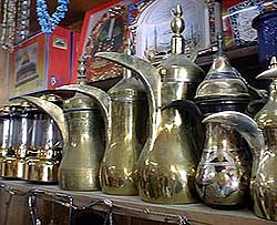 A key element of the Greenstar program is to provide a connection to electronic commerce for local villages, so they can economically offer local products for sale to a worldwide market. The tapestry and stringed "rebaba" instrument above were both made by Al-Kaabneh villagers for their own use, and will shortly find their way onto "Al-Kaabneh.com."The hand-blown glassware and beautiful brass coffee servers below are made in nearby Hebron. These products, including a slingshot identical to David's from the Bible, ancient clay oil lamps and vases, a shepherd's unique double-barreled bamboo flute, and artwork created by local students, will help provide a steady source of cash income for the villagers.